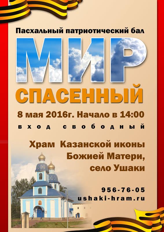 8-го мая в селе Ушаки у Храма Казанской иконы Божией Матери пройдет пасхальный патриотический бал "МИР СПАСЕННЫЙ". Начало программы в 14:00. Вход свободный.